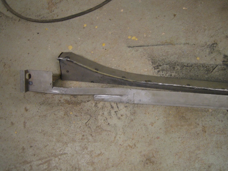 Som ni ser fick jag kapa bort både främre och bakre domkraftsfäste tillsammans med tillhörande top-hats. Fick även laga ett par hål i golvet ovanför dessa balkar. Jag försökte laga så original-likt som möjligt i skarven mot främre hjulhusen. Efter epoxi blir det karosskitt i spalten. Till det bakre hålet använde jag lite plåt jag räddade ur golvet på donatorbussen. På så sätt fick jag rätt form direkt.