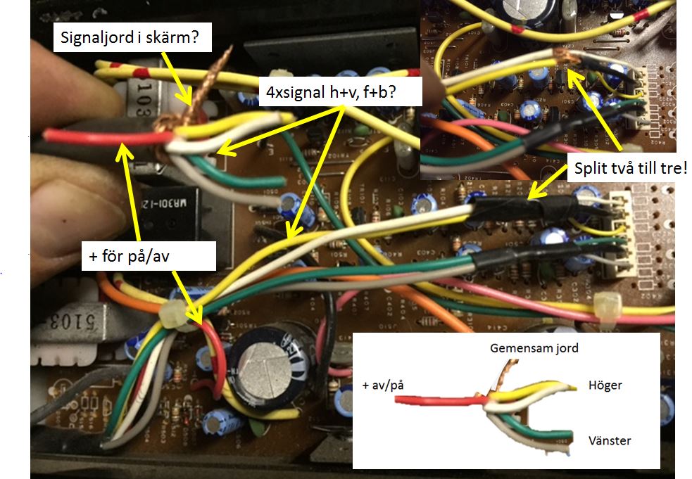 Där signalkablarna går ut från kretskortet 3 + 3 st, är gul, vit, grön och grå respektive kanals "+" de 2 andra anslutningarna mellan vit-gul och grå-grön är gemensam (för vit och gul samt grön och grå) anslutning för jord. Att det blir 2+2 kablar sedan är för att jorden går som skärm i resp. gul, vit, grön och grå kabel.
