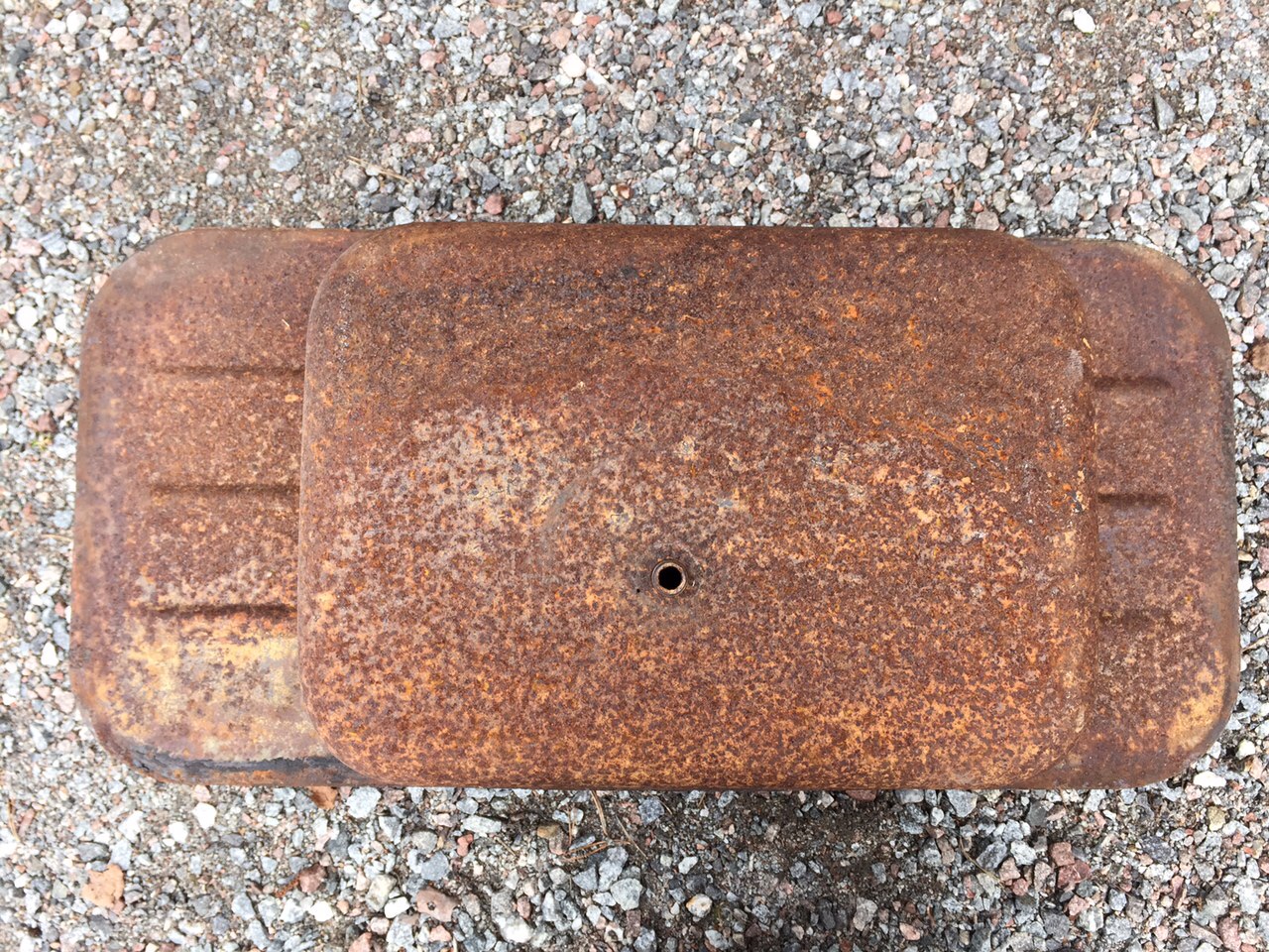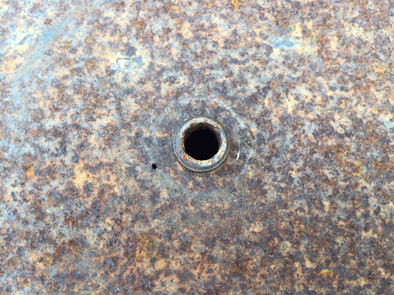 Något rostig men inga hål förutom ett minimalt vid sidan av utloppshålet. (Där bensinkranen ska sitta -se bild)