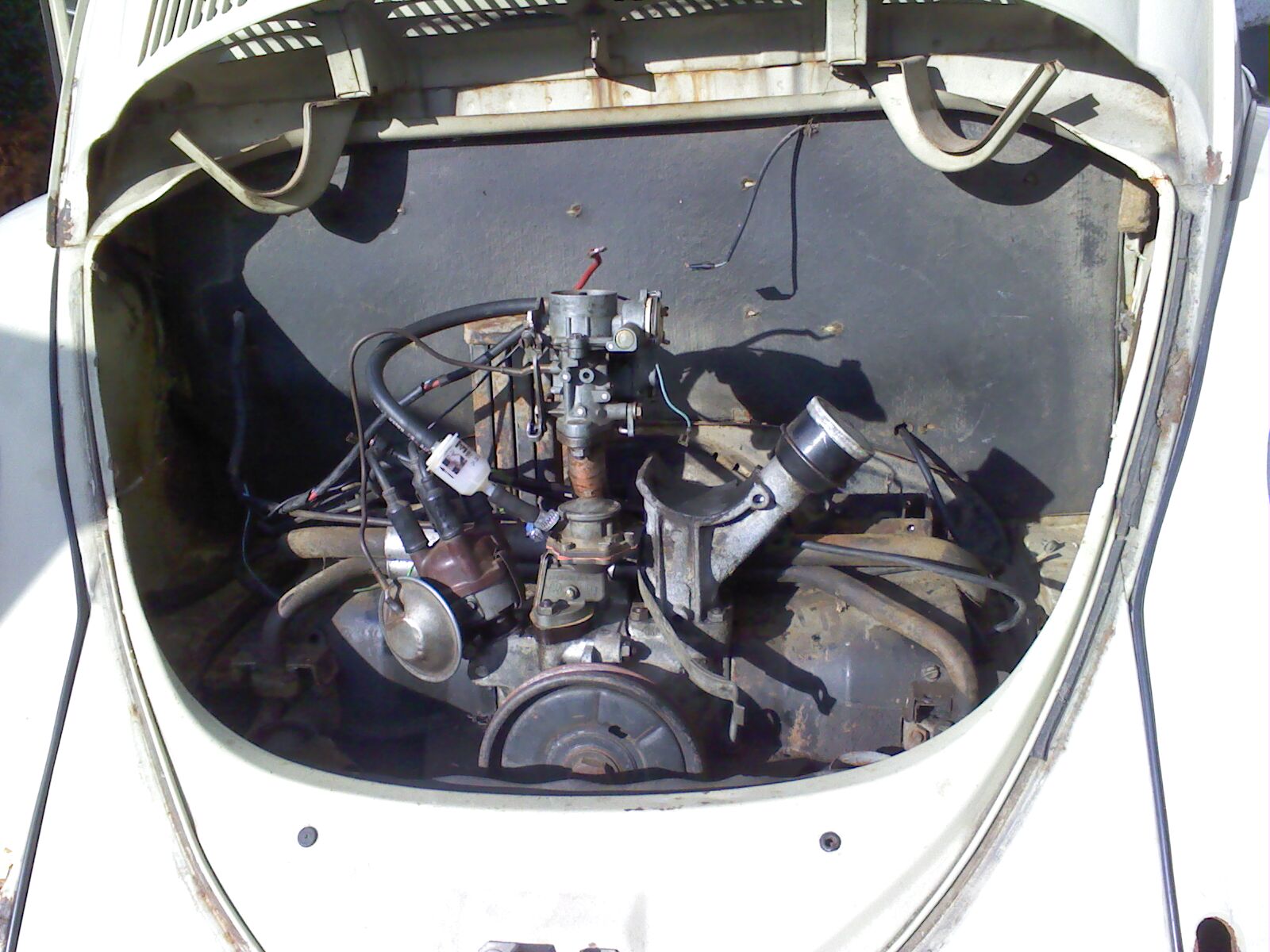 Man borde lossna fläkten (36mm pipe fra bakside, kom ihåg alla shims i rekkefølge) och får bättre tilgång hvis man tar av motorhuven.