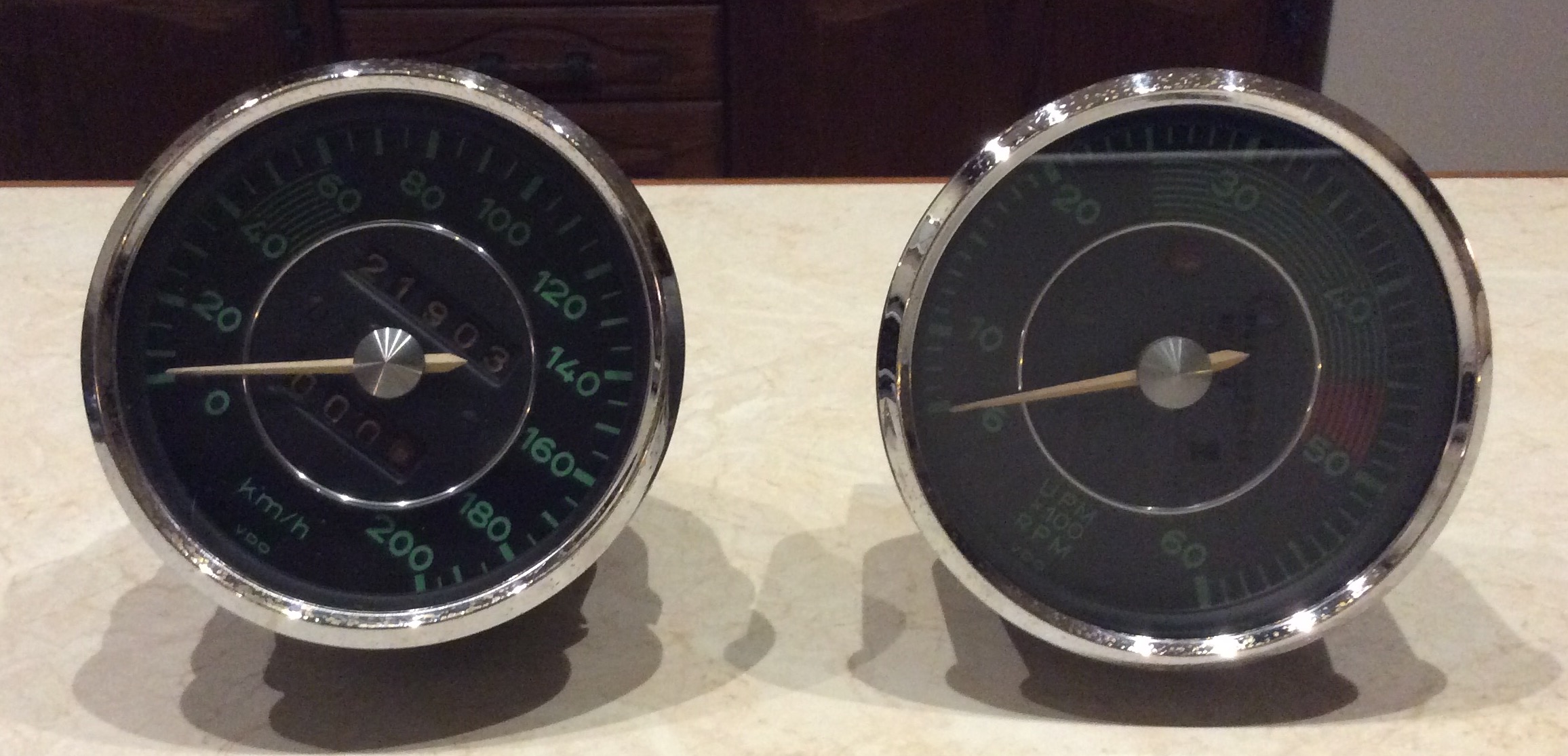 Porsche 356  hastighetsmätare och varvräknare . Daterad  10/56 . Säljes som par. Bra skick-lite prickar på kromringar,kan nog poleras. Pris 8500:-   Finns i Helsingborg.