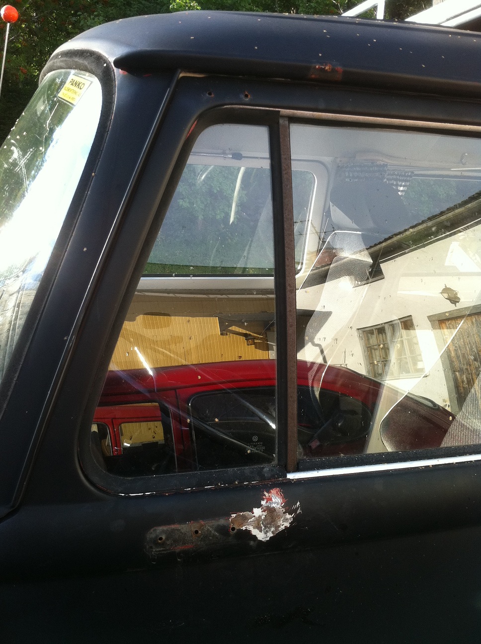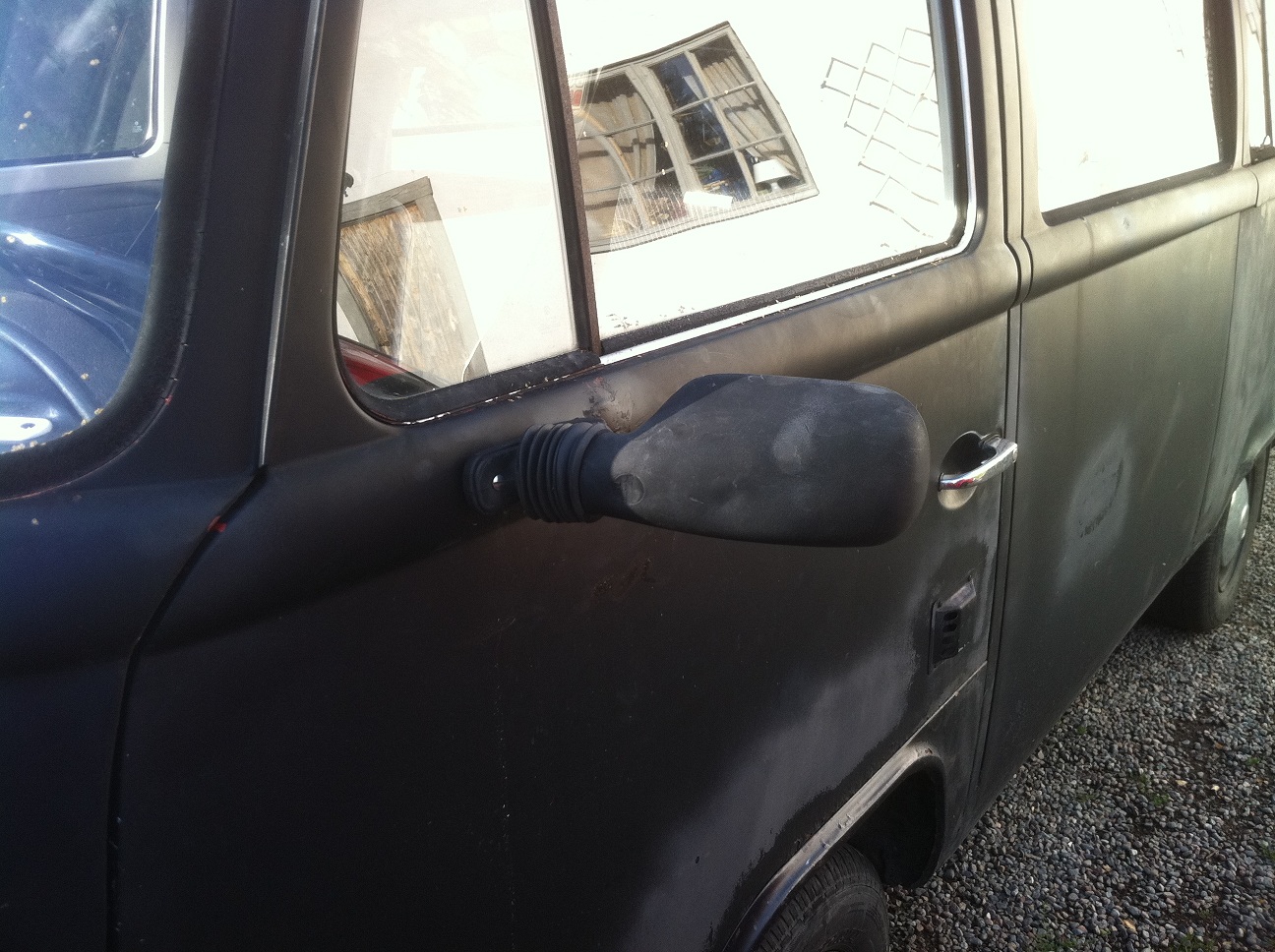 Tänkte byta ut de små fula backspeglarna jag har på min -75 mot riktiga busspeglar, men hittar inget hål i dörren. Ser inte ut att finnas nåt igensvetsade heller...?