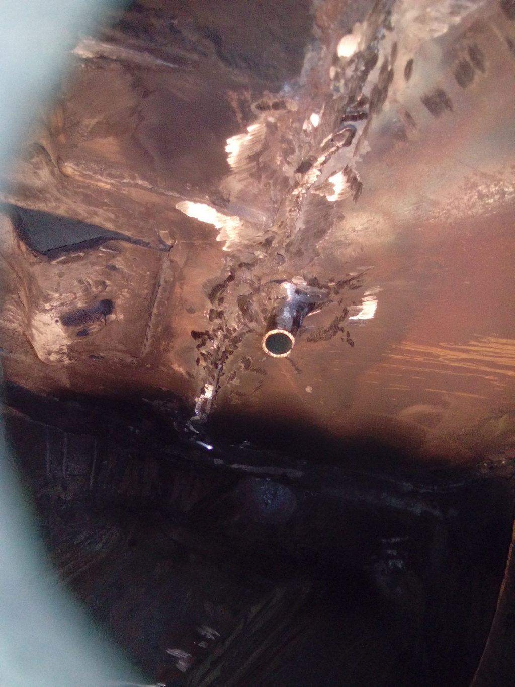 Här är höger sida med rostlagad balk och batterihylla.  Den undre bilden visar dräneringsröret som jag har svetsat på golvet i batterihyllan. Jag har haft problem med vatten som kommit in.