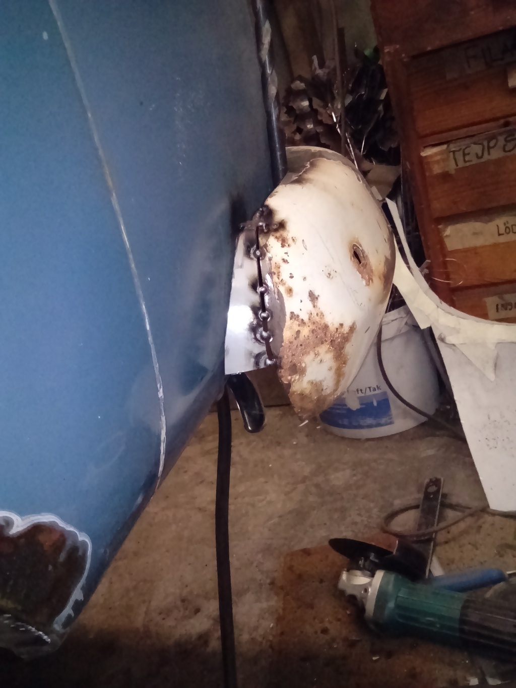 För att komma närmare karossens plåt fick jag lov att ta bort den utstickande plåt biten.
