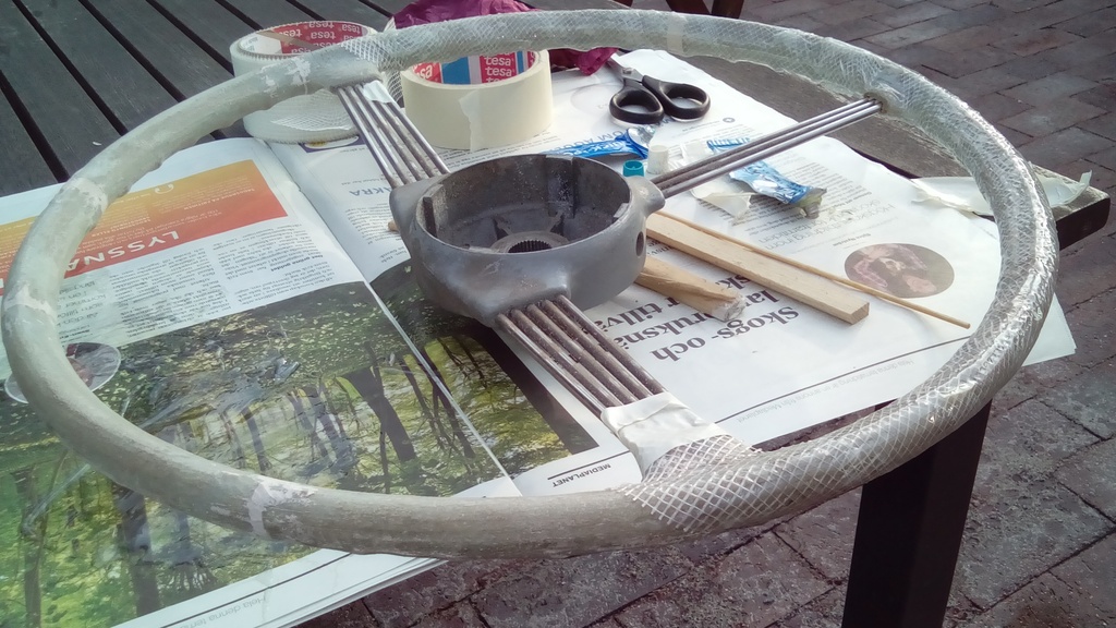Det andra jag jobbar med är att få ordning på ratten jag tänkte använda. Jag har tänkt använda mig av en ratt från en volvo -54. Men den är grymt sprucket på rattringen så jag visste inte riktigt hur jag skulle lösa det problemet. Jag ville ju inte att ratten ska falla i bitar när jag körde. ICQ/ad Jag håller på att lösa problemet på följande sätt. Först spacklade jag igen alla sprickor och hål med Plastic Paddig. Sen tog jag skarvremsor. Alltså sånt nätband som man har och sätter på skarvarna när man sätter gipsskivor. Den är självhäftande och lite elastisk.