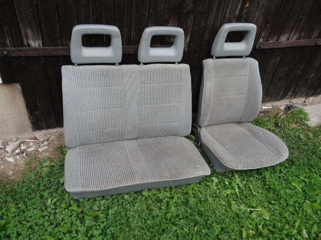 Enkelsäte och dubbelsäte i grått tyg, förarstolen lite sliten på något ställe men ej hål