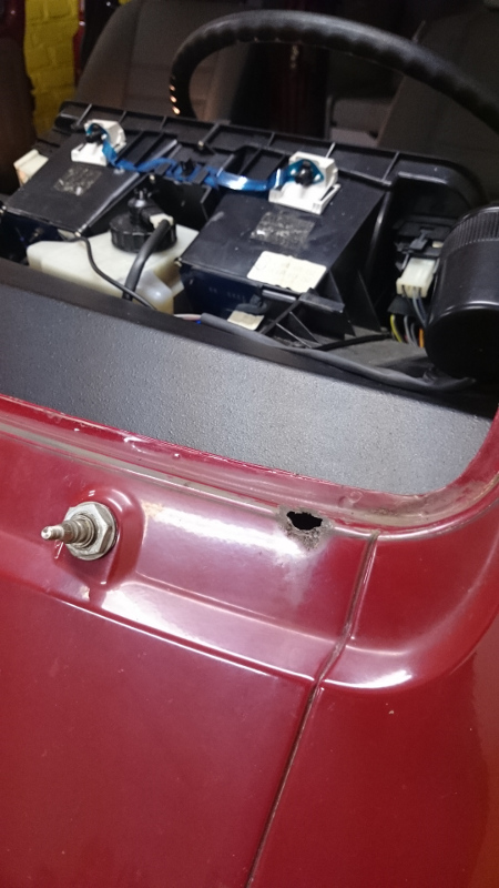 En mindre rostskada under vindrutan behövde åtgärdas. Detta resulterade i att vindrutan och instrumentpanelen behövde demonteras. Dålig plåt kapas bort, ny plåt svetsas i och sen lite spackel, slipning och lack.