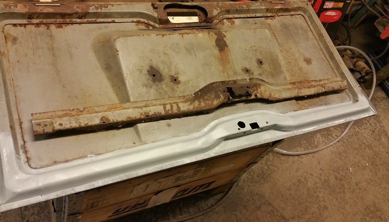 Då jag höll på med att grotta med bromsljus och nummerskyltsbelysningen så såg jag att bottendelen av förstyvningsramen på motorluckan var ganska dålig/skitdålig så var det bara att se vad som kunde göras åt det.