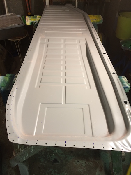 Det blev en stund i garaget ikväll, passade in golvplåten, stansade ca 80 hål och svetsade dit bakplåten.