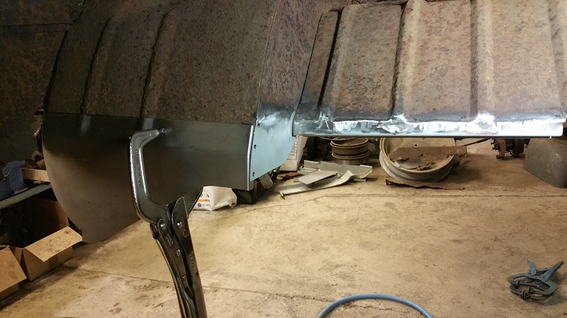 Till slut så hittade jag tillräckligt med svetsbart material  ICQ/ae Så efter lite mallande och tillyxande av några plåtar så var det bara att tända svetslågan igen och sömma ihop den bakre delen av hjulhuset.