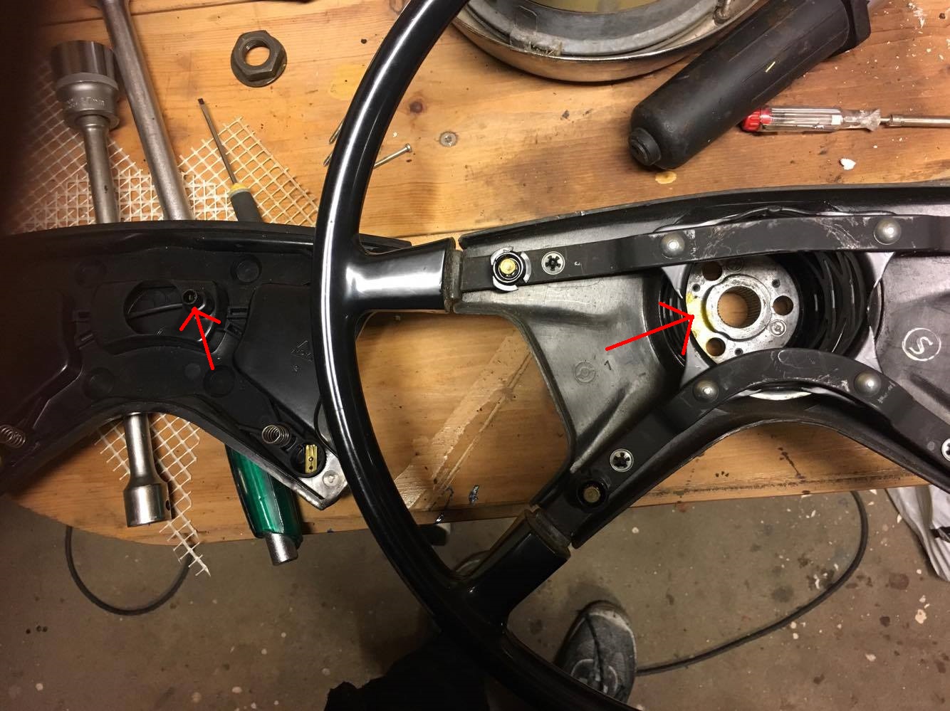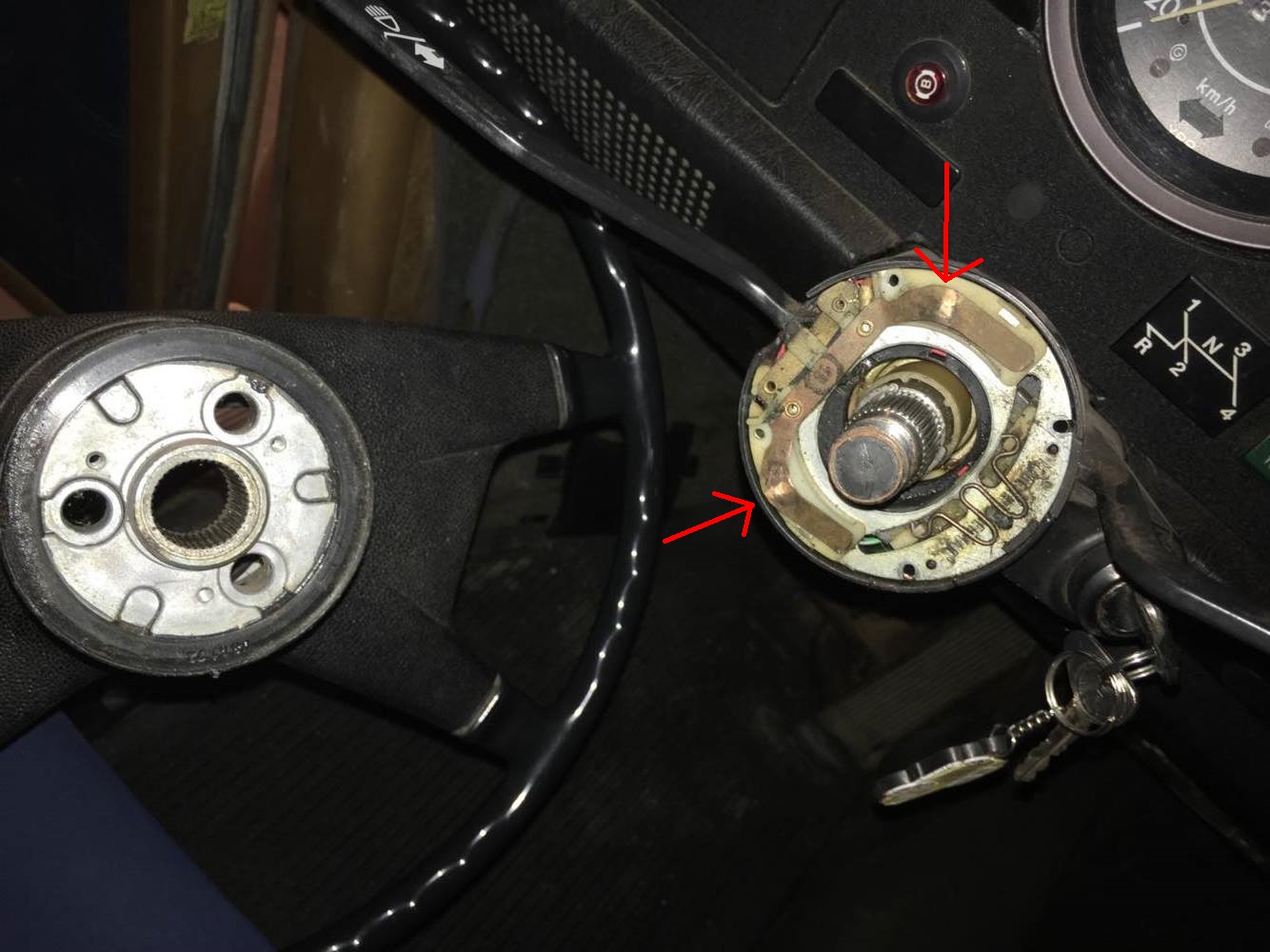 Hej! Har en 1303s från -73 där jag håller på och kollar elen för tillfället. Upptäckte att tutan inte fungerade och började luska runt lite vad som var problemet. Upptäckte att jag saknar en del och det är därför jag vänder mig till er! Jag saknar kabeln som går till tutknappen på ratten ner mot tändningen ska försöka få med bilder där det blir tydligare. Antar att blecken dit jag målat pilarna har något med saken att göra? Det jag undrar är om någon har möjlighet att ta en bild eller få fram en bild på vad det är jag saknar eller ännu bättre om någon vill avyttra denna delen så jag kan få tutan att ljuda igen