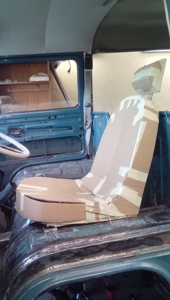 Igår ägnade jag mig åt pappslöjd. Jag som många andra som bygger om hjulhusen har problem med att hitta en vettig lösning på stolfrågan. Jag har byggt underrede och monterat plast stolar på plats. Då sitter jag riktigt bra. Tyvärr så ser dom allt för spinkiga ut för min smak. I går försökte jag råda bot på det genom att bygga ut stolen med pappkartong så att jag skulle få en form som jag känner mig nöjd med. Min tanke är att bygga om formen lite gran på stolarna med hjälp av trä och glasfiber. Och sen bygga upp formen med tjock och hård skumgummi. Sen sy upp en fin klädsel i ett färgval och mönster som sen går igen på andra platser i bussen. Så som dörrsidor och sätena bak.