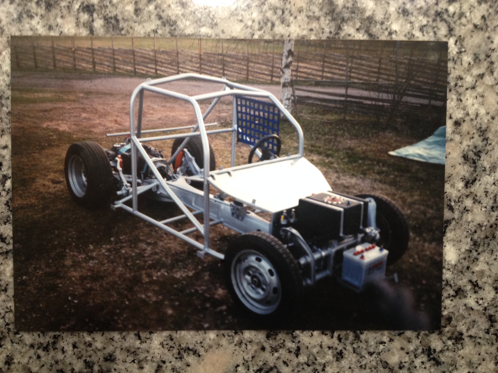 För rätt många år sedan byggde jag min racebil och fick då hjälp av Ola Öst med framvagnskortning och kortning av bakvagnen. Karossen avlyftsbar, Sway-away och 30mm torisionsstavar inköptes av A.Fridh. Kraftiga dämpare som sattes på max tröghet på utfjädringen för att minimera att bilen släpper fästet när kopplingen trycks ner mellan 1-2áns växel. Medarna som håller växellådans bakre fäste fick förstärkning(se bild).