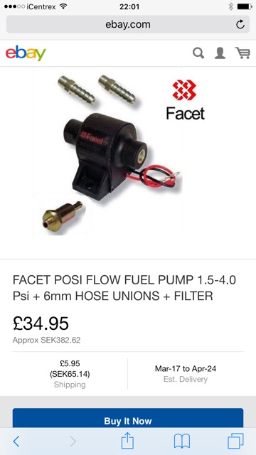 Har mest kollat på Facet då jag fått för mig att de är bra. Vilket max flöde bör jag ha? Vilket tryck? Har btr så kanske kan välja en med lite högre tryck? Kommer inte ligga på så höga varv några längre stunder. Lite roligare gat bil bara ICQ/ab