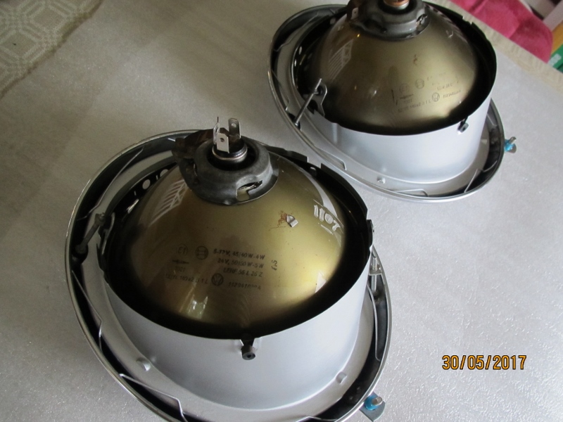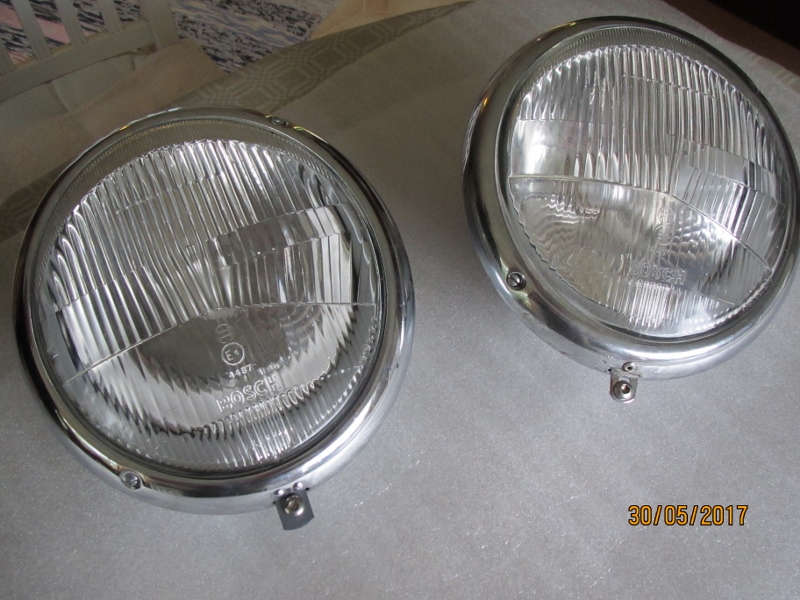 Passar 50- och 60-tal. Mycket bra kondition. Reflektorerna är nya. Bilder innan monteringen kan fås på begäran. En skada "kl 6" på ena kromringen.