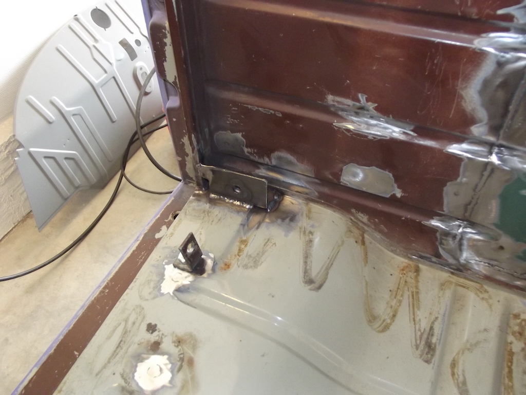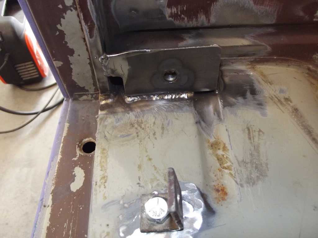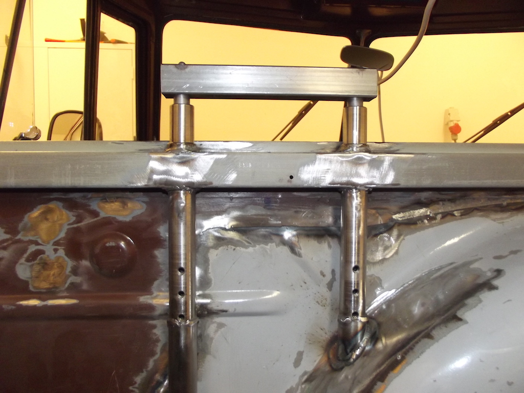 Jag bockade till några plåtbitar i 3mm, de har en påsvetsad M12 mutter på baksidan för att fästa bulten i. Jag har försökt göra denna fästplåt så att den får tag i bussens struktur där den är stark, bl.a. i dörrkarmen. Nu sitter den som berget!