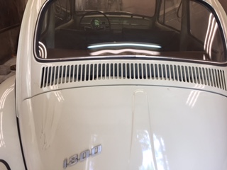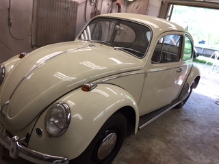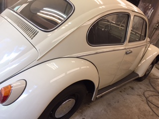 Bytta skärmar, fotbrädor, bromssystem, koppling och värmek & ljuddämp. Nylackad, skärmar, dörrar och luckor lackerade var för sig, samtliga fönster uttagna, nya gummilister runtom fönster och luckor. Originallack Pärlvit.