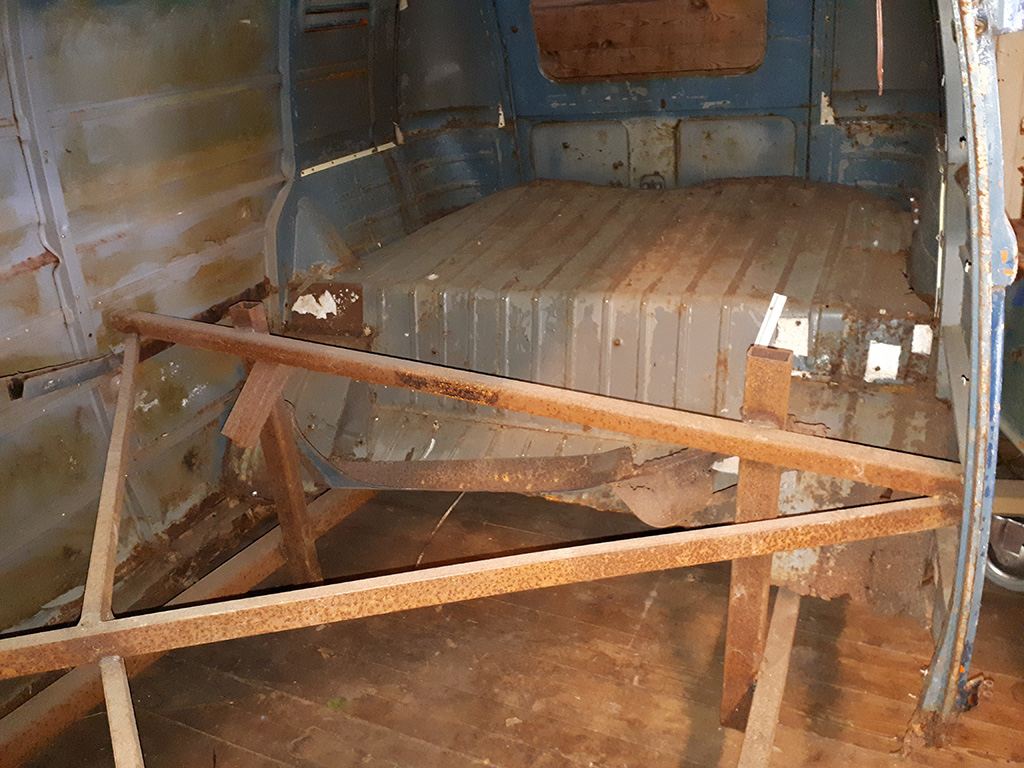 Kvar finns framdelen med komplett framvagn så finns det en bakvagn från en senare splitbuss och däremellan ett balkkit från Fidde med rambalkar, I och hatt profiler, innertrösklar.