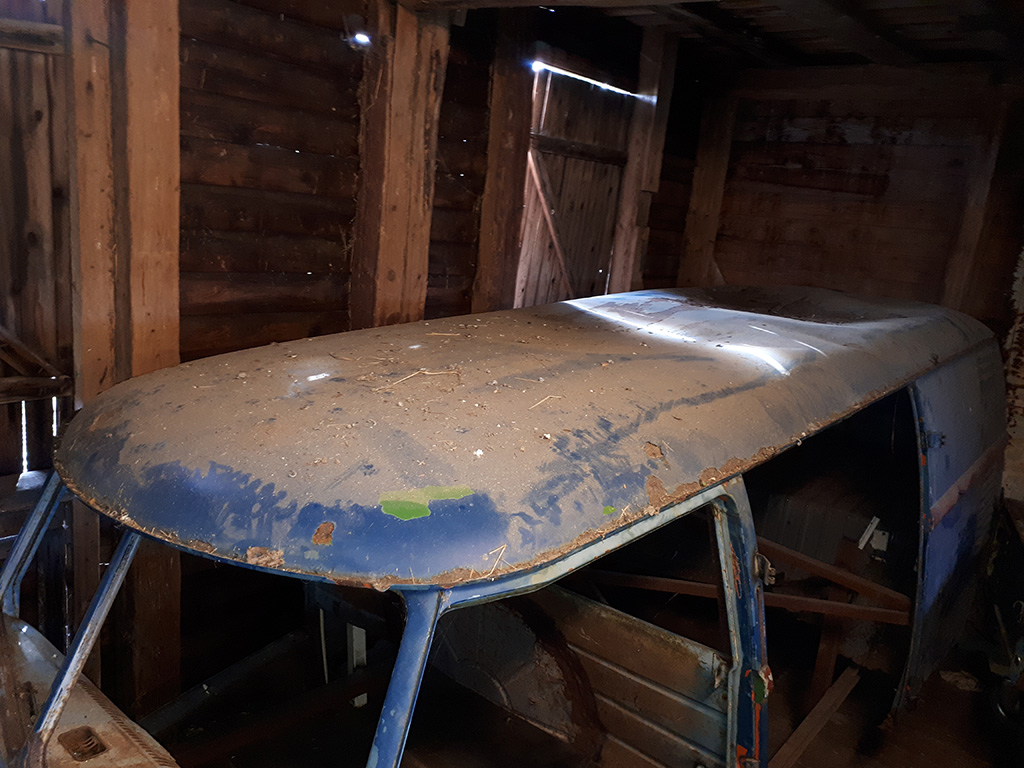 55/56 Panel, skogsvrak som tidigare ägare hade nån ide om att sätta karossen på ett Porsche Boxter chassie så bussens ram är bortkapad.