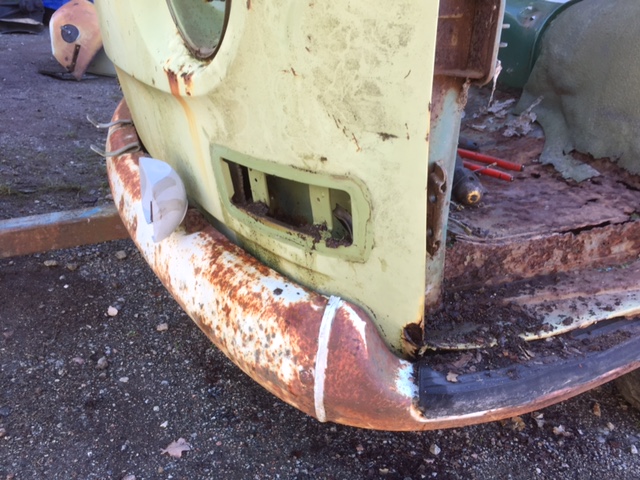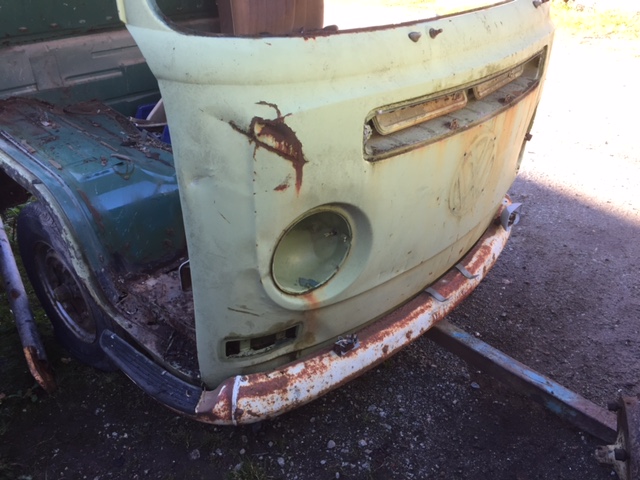 Front. Endast ett litet rosthål vid vänster a-stolpe. Några bucklor höger sida. 1000:-