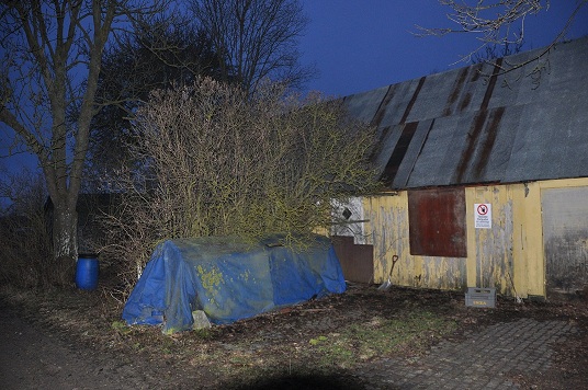 Bussen hade tydligen körts på plats därefter har skjulet rests och stora plank runt fastigheten har spikats upp.