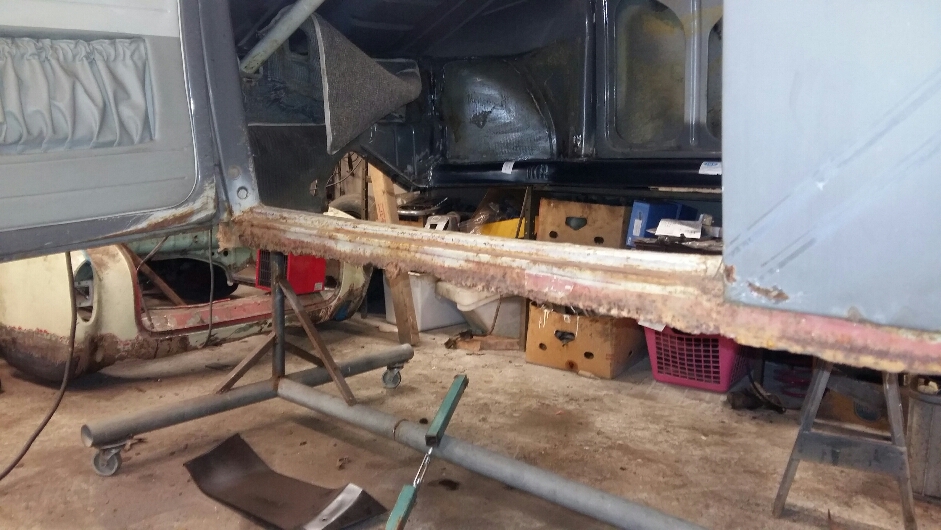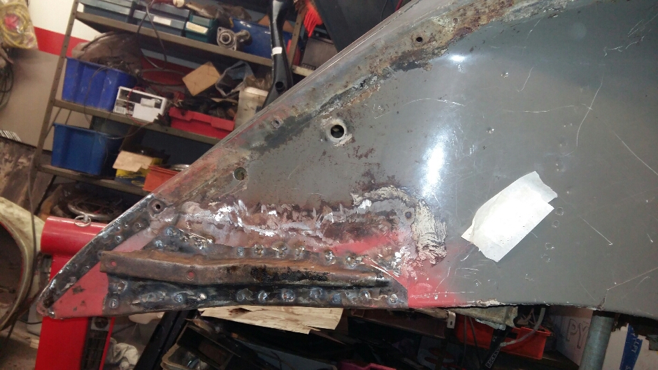 Gamla lagningar i karosserifästen bak var inte så roliga, lapp-på-lapp metoden hade praktiserat friskt. Nu är det ny plåt i innerskärmen och dubbelplåten. Själva fästen såg att vara "nytt", så det satte ha tillbaka på Rätt plats med pluggsvetsning inte som tidigare där det var svetsat i ytterkant
