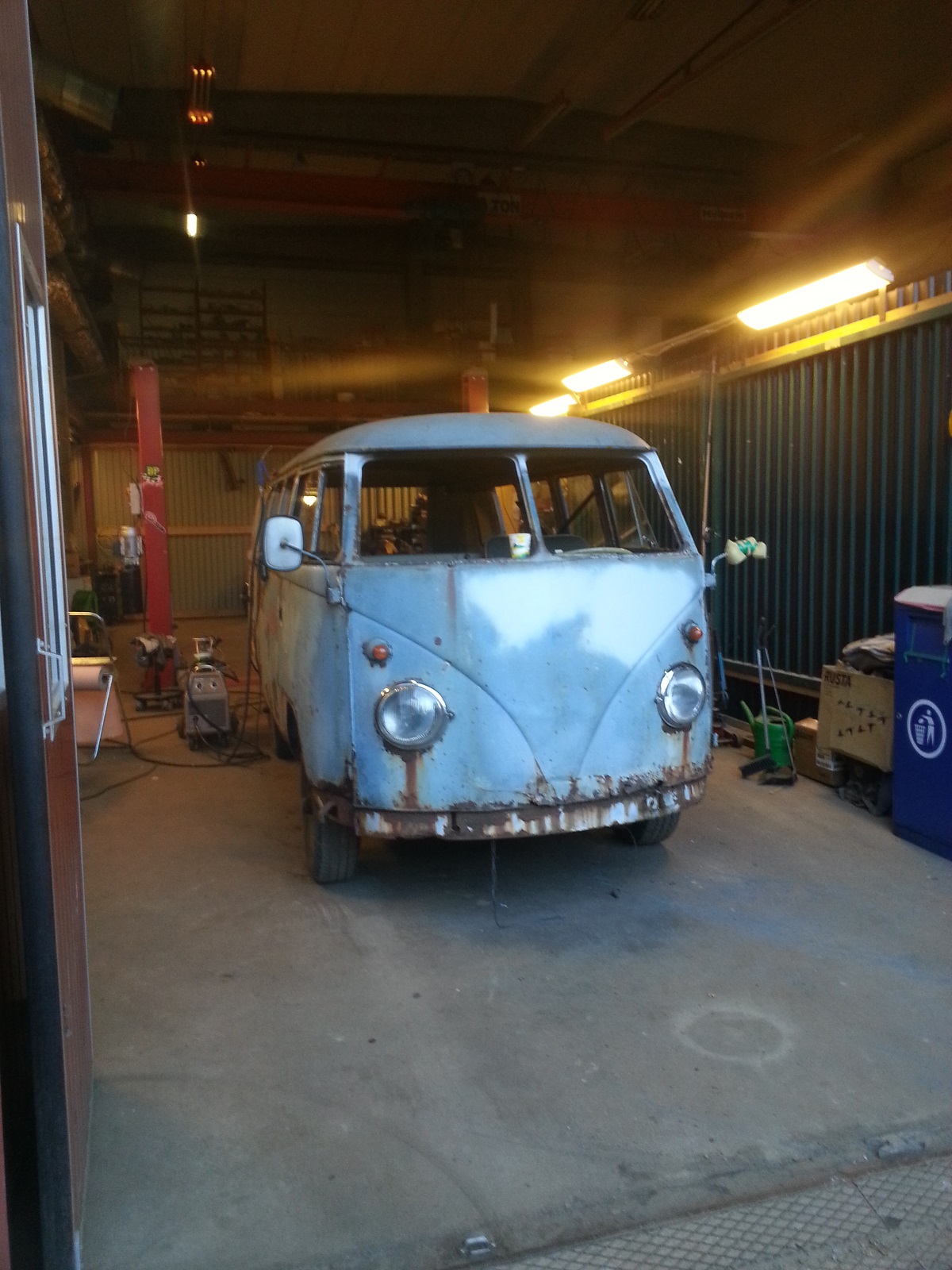 Fortsätter med taket. Ett väldigt mätande och lyftande av taket av och på, det var verkligen guld värt med travers. En utmaning var att taket kommer från en -67 med skjutdörr på höger sida.. Min har ju lastrumsdörrar på vänstra sidan. Bakluckan och utseendet på taket där bjöd ju också på lite att göra. Ber om ursäkt igen för de dåliga bilderna, jag ska uppdatera med ny telefon!