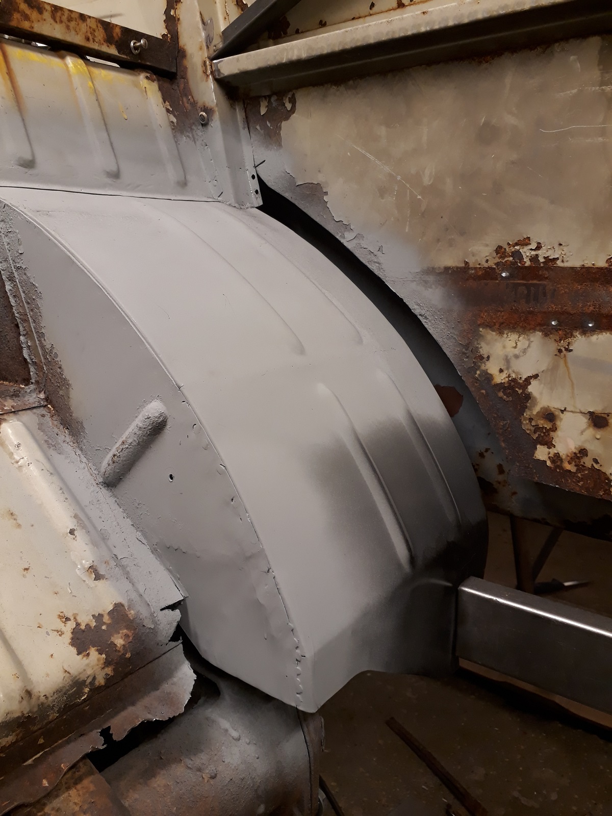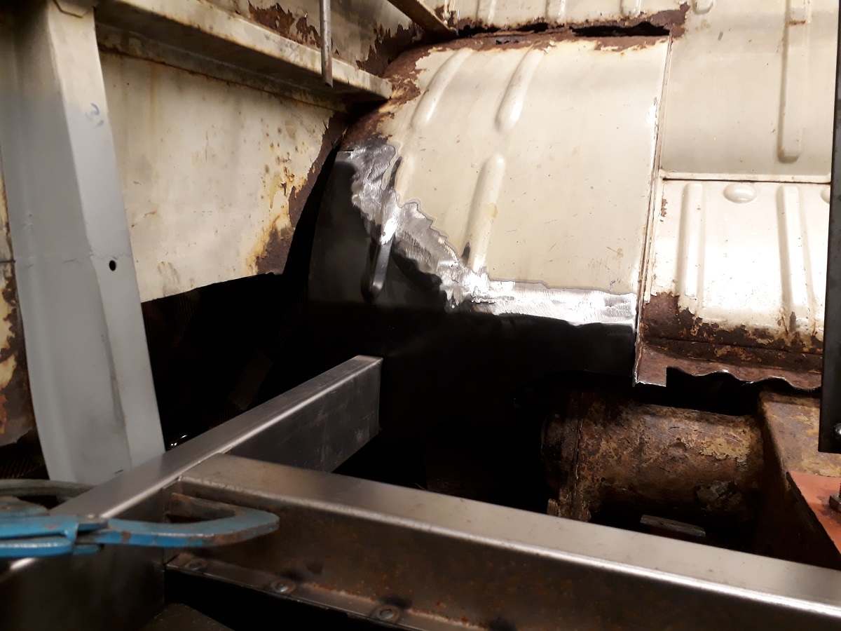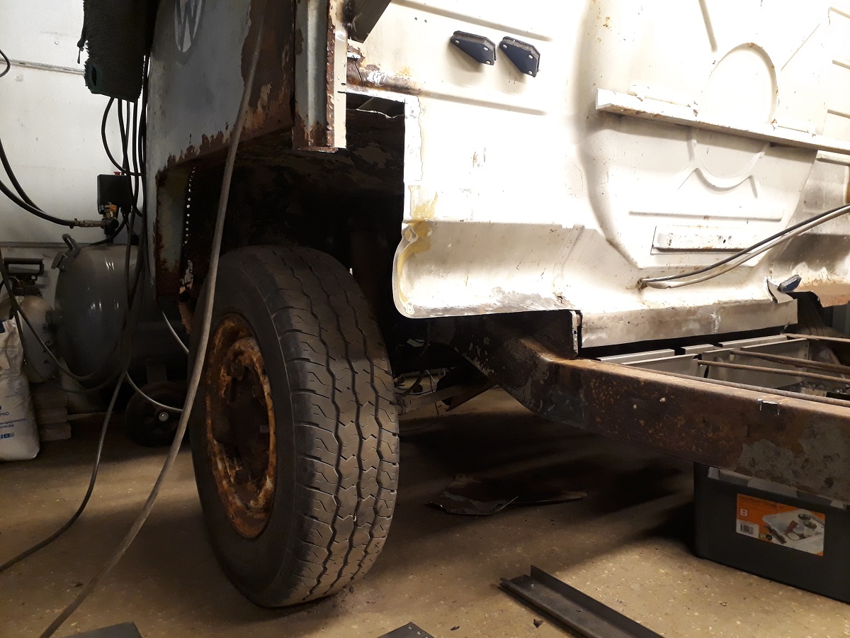 Vaknade tidigt i helgen och hade driv. Bäst att passa på. Lagade nedre delen på hjulhuset. Svetsade fast alla balkar, i med rör för handbromsvajrar och växelstång. Bytte nedre delen av långsidans lodräta balkar. Upptäckte att karossen hängde ner 12mm när dessa skulle passas in i innertröskeln. Lyfte lätt med domkraft - passade klockrent. Sen var jag tvungen att prova den nya framskärmen  ICQ/ab