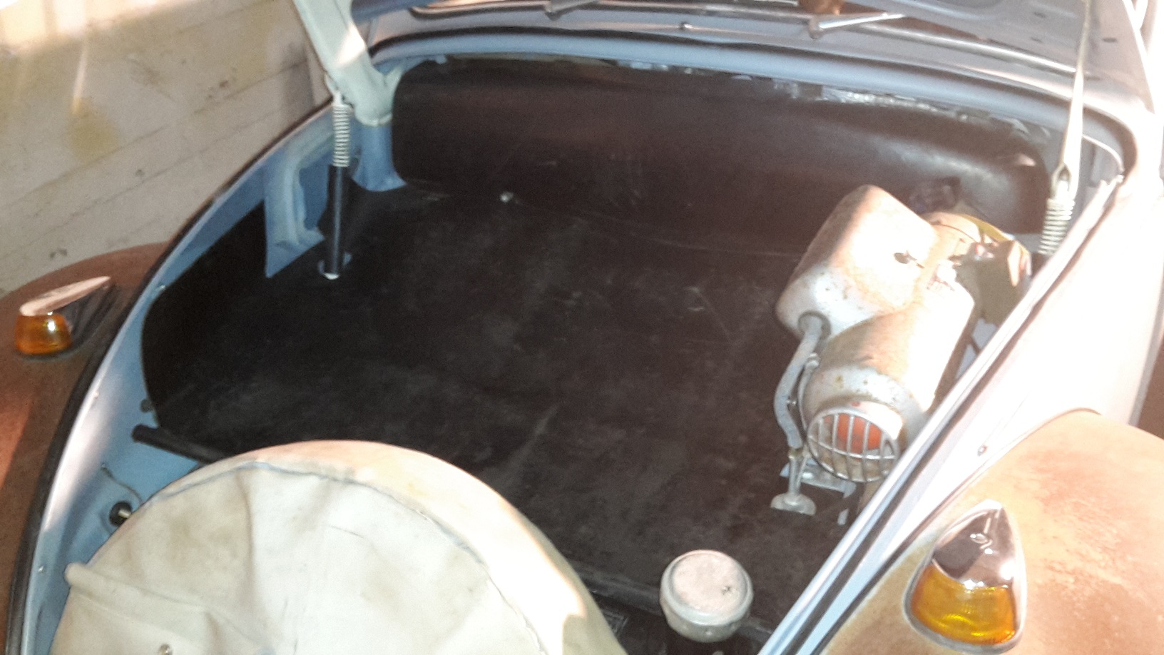 Sedan, vad saker och ting ändrar sig, eller vad man ändrar sig under resans gång. Tänkte ju att, innertaket det är ju ganska fräscht men nää... Så har beställt ett nytt sådant:) Dessutom ligger det ju en plastplatta mellan spännena och främre träbågen. Det verkar som karmann kan ha klätt en skiva med vinyl ibland och ibland är det en "präglad" plastplatta. Min har original haft plasten. Den blir också ny, ifall någon undrar;)