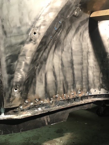 Men golvet i reservhjulsbaljan har krympt och hänger någon cm ovanför där det ska vara, så bort med några punkter och sänk ner till rätt ställe. Laga hålen, svetsa fast kant i kant istället för omlott.