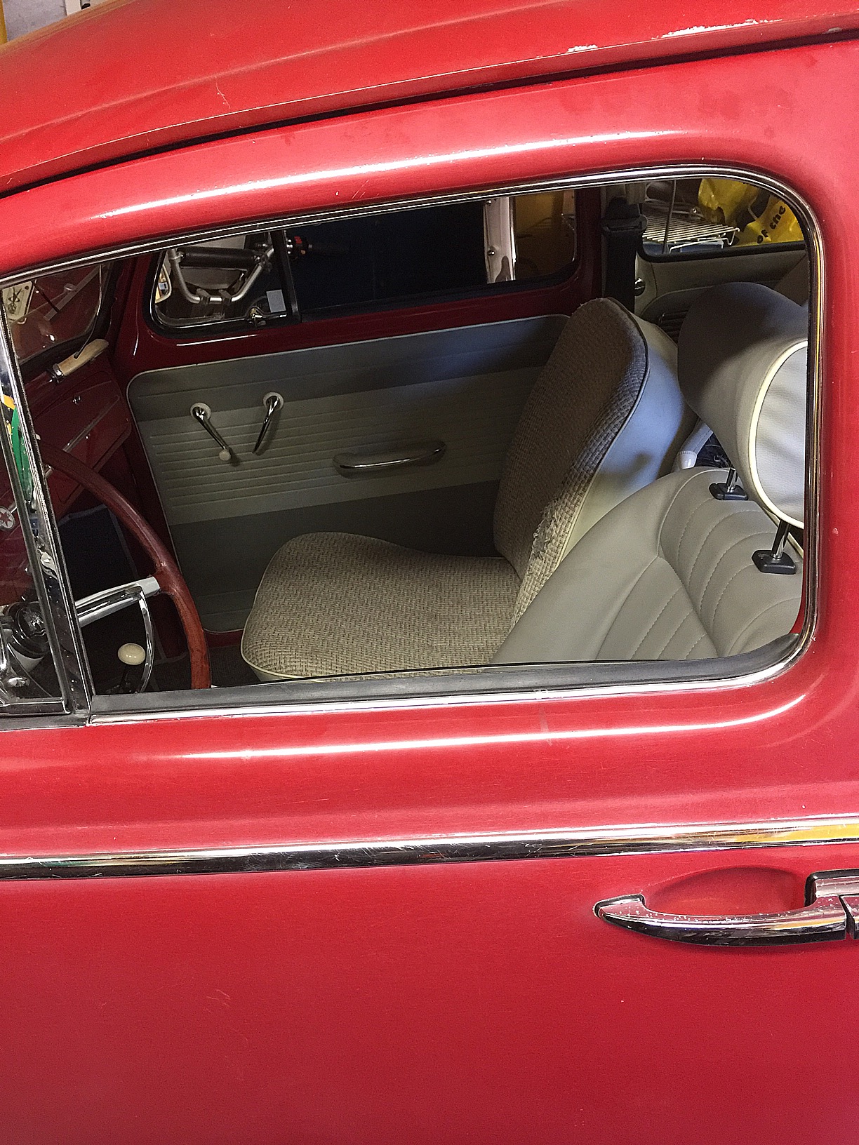Blev såpass klar att jag kunde provsitta. Matchar inredningen nästan perfekt. Den vita kederlisten har redan gulnat lite så att den matchar bättre än när de var helt nya.