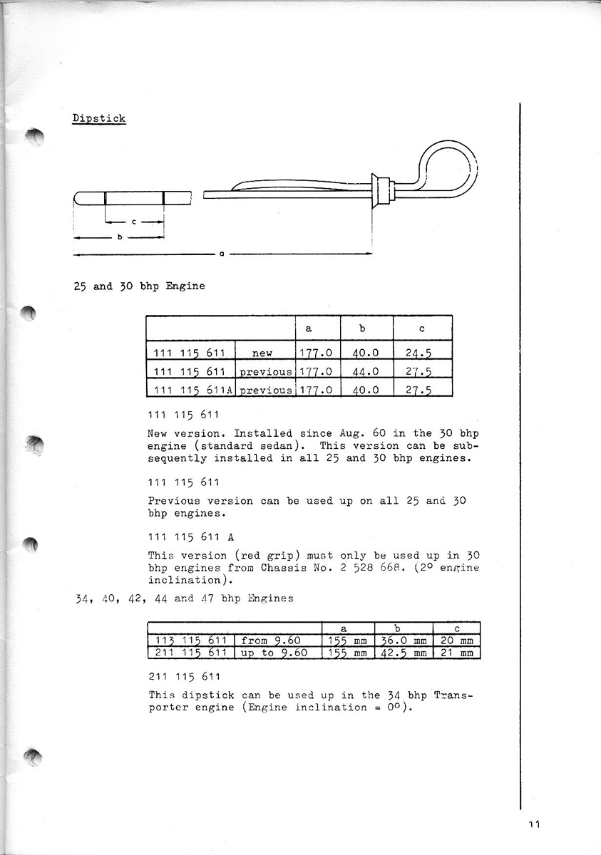 Oljestickan på en 60:a var rödmålad från början. Det övre strecket ligger på 40 mm när det på en "vanlig" ligger på 44 mm. Det undre strecket ligger på samma nivå. Total längd på stickan från spetsen till toppen på locket under handtaget är 177 mm. Detta bara för att motor och växellåda är sänkt 15 mm i framkant för att få annan påverkan på cambervinkeln bak.