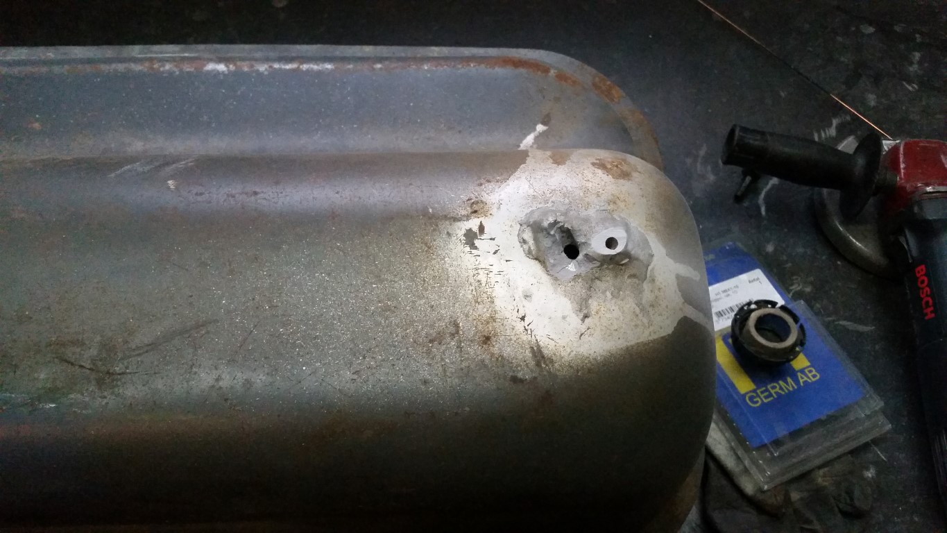 Bensinrören var bara nedstuckna i tanken och tätad med nån smet och hålen för avgasrör m.m såg ut att vara gjorda med hammare och huggmejsel så äve om det inte blir nån rostlagning så blire och svetsa igen dom hålen.