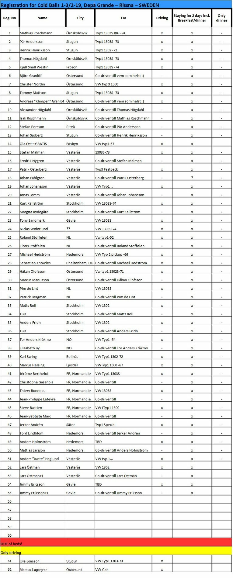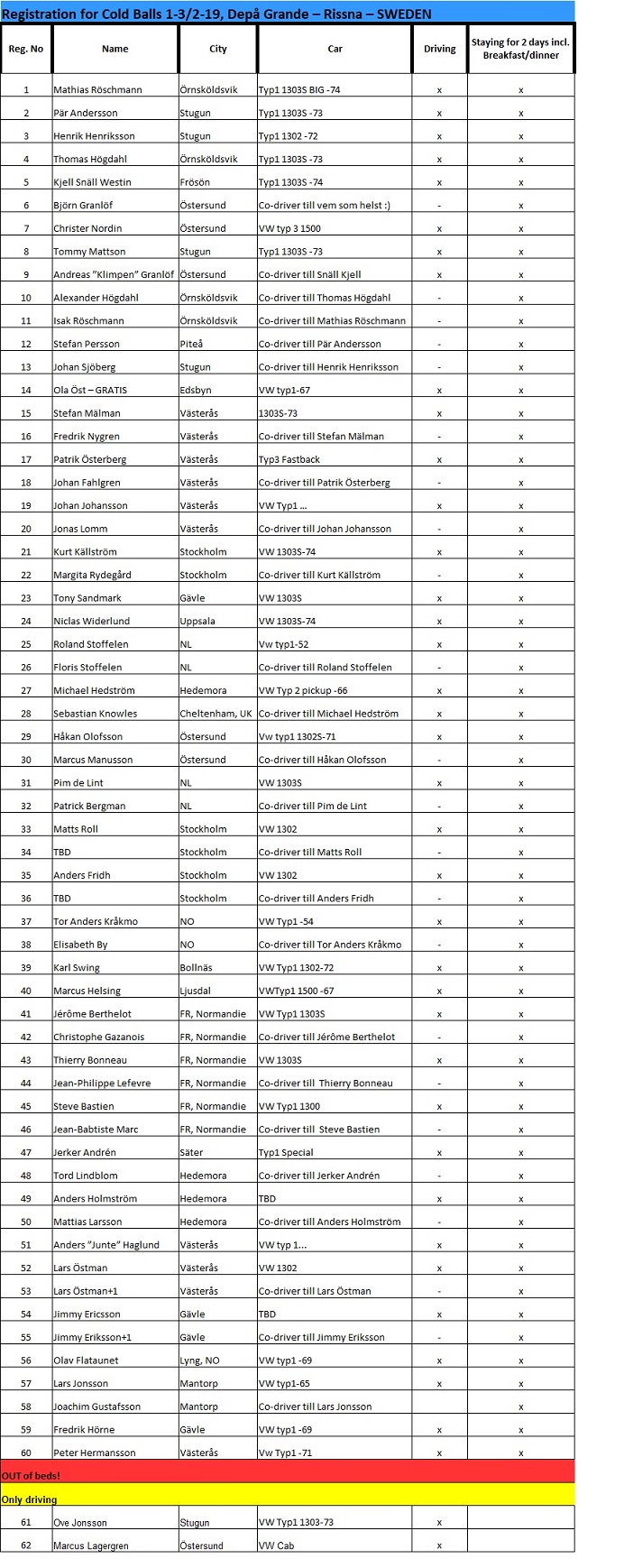 Ev. co-driver åker med i bil utan extra kostnad. Max en co-driver per bil.
