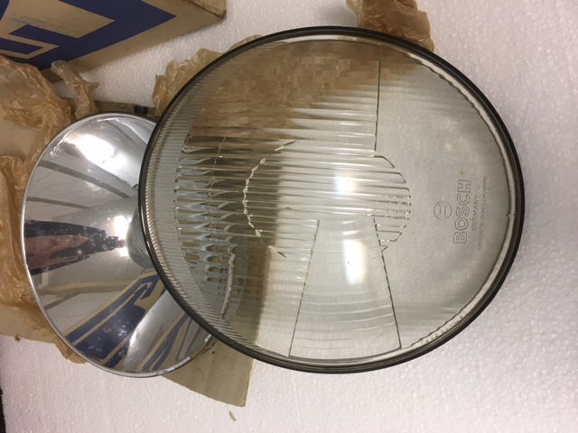 Det här är ett komplett set med glas och insatser som har stått i mitt garage mer än 30år. Som man ser på kartongen så är det från tiden då vi behövde byta glas inför högertrafiken. Jag håller på att städa garaget så därför ligger den nu på tradera tillsammans med en del andra delar som blivit över.