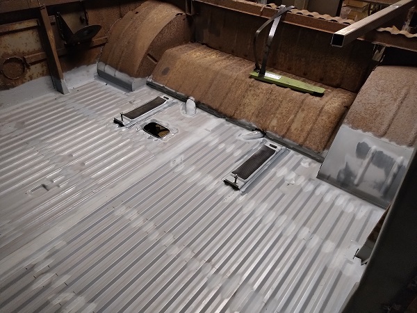 Slipade svetshögarna på golvet och efter det så primade jag plåtrena ytor efter lite rengöring.