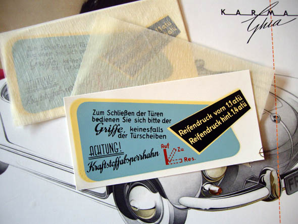 Han har även gjort en kopia på märket som alla ghior har på handskfacksluckan. Finns med engelsk eller tysk text och i två olika utföranden beroende på årsmodell. Upp till och med 61 har ett utförande där även bensinkranen är avbildad.