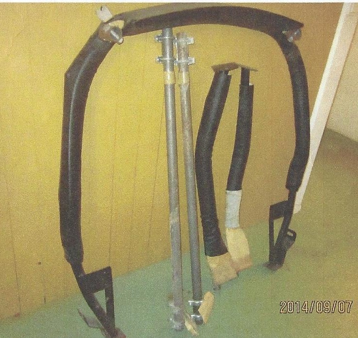 Båge med bakstöttor. Fästen för rullbälten. Står och samlar damm. Finns i Helsingborg. Medföljer 2 st stålrör, som var tänkta till dörröppningar.