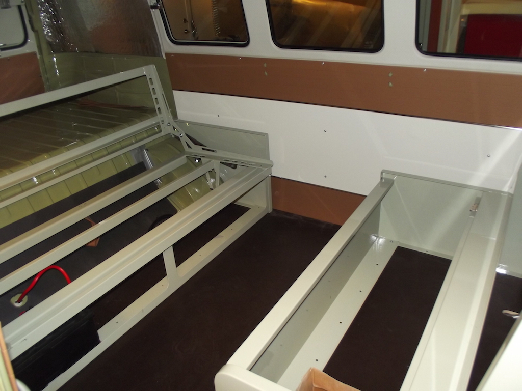 Klassisk layout med "club seating" och ett bord mellan sofforna. Stommarna är av plåt från CE. De var ganska simpla i utförandet och levererades som platta paket där delarna skruvades ihop med synliga skruvar. Praktiskt för transporten förstås, men nu är de ju här hos mig och ska inte transporteras nåt mer. Därför svetsade jag ihop dem i skruvhålen och slipade ner svetsarna.