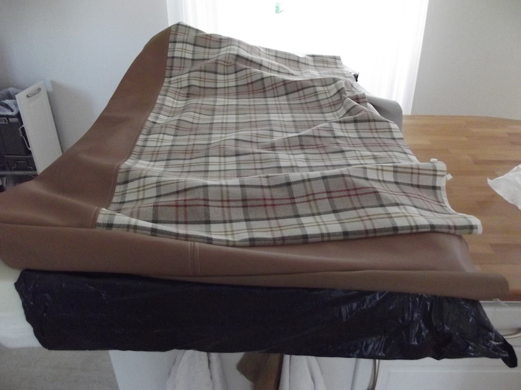 I mitt garage finns en gammal symaskin för båtkapell, den gick varm denna vecka. Sydde "påsar" som är lite mindre än skumgummit, då sträcks tyget fint vid montering. Ett bra tips jag fick av nån är att klä skumgummit med plastsäckar, då glider påsarna på lätt. Sen klipper man sönder plasten och drar ut den.