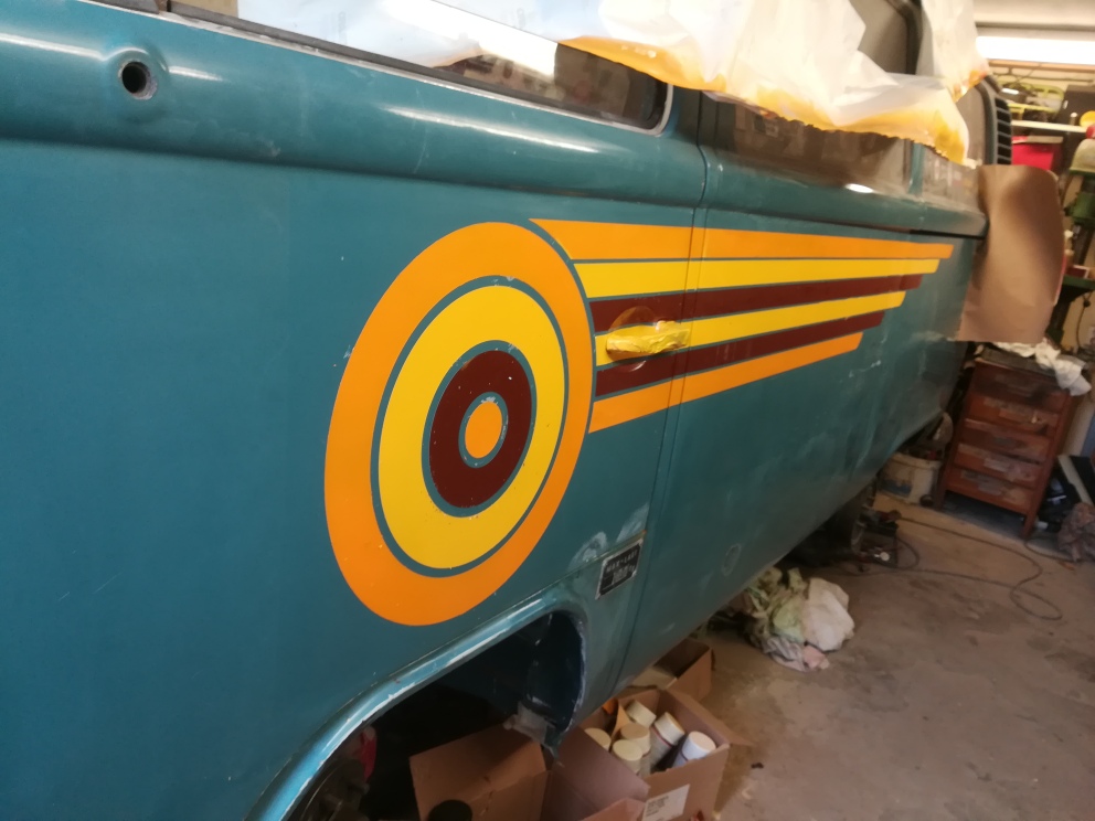 Här rullar det på så sakteliga i dessa semestertider. Det är inte så mycket att visa på bild. Jag har fyllt på bromsvätska igen i systemet efter renovering och byte av bromsrör. Sen har jag nog lackat allt det blåa på karossen så det täcker mina rostlagningar. Nu kommer det som jag har sett fram emot länge, nämligen att ge utsidan det utseende jag har tänkt mig. Jag tänkte lacka taket vitt och sen ska jag lacka mönster/logga på bussens sidor. Efter det tänkte jag patinera bussen så hela bussen får ett sammanhängande utseende.
