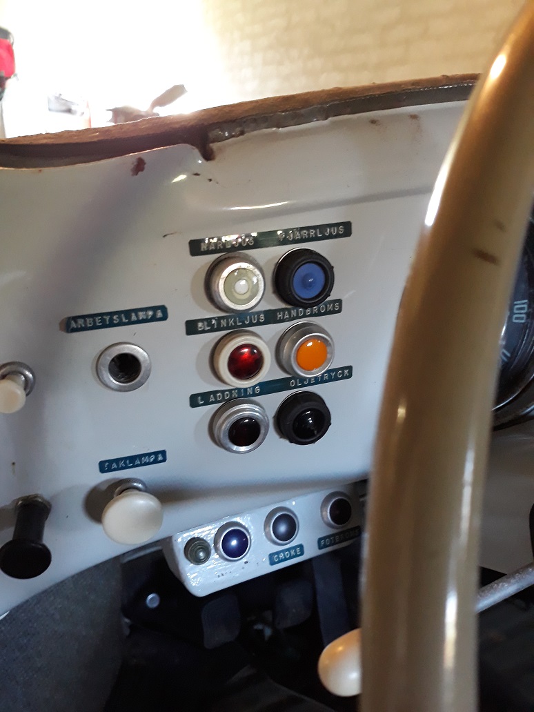 här kommer lite mera bilder, som sagt min farfar är noggrann och gillade att skruva och fixa så finns en hel del extra utrustning på bilen, på instrumentbrädan finns massor av lampor och knappar som ni ser på bilderna. Vill man ha bilen veteranbesiktad så måste ju allt sånt tas bort men jag behåller hellre den i "farfars" originalskick så har vi ett roligt minne av honom ICQ/ab  måste iaf försöka reda upp alla kablar och elgrejer så det ser snyggare ut iaf  ICQ/ag