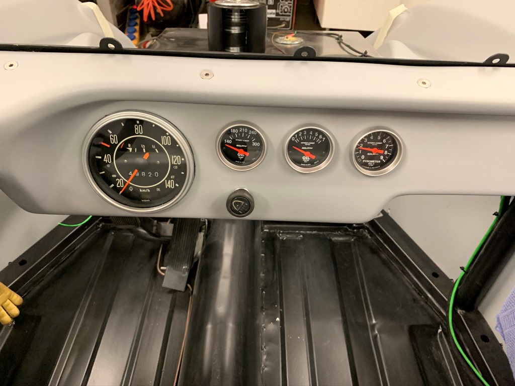Det är kul att se en instrumentbräda med endast en ljusknapp i jämförelse med hur dagens bilar brukar se ut. Genom att måla ytterringen på hastighetsmätaren i samma färg som Autometermätarna samt montera den på liknande vis, med en bygel på baksidan, blev det en ganska bra matchning tycker jag:-).