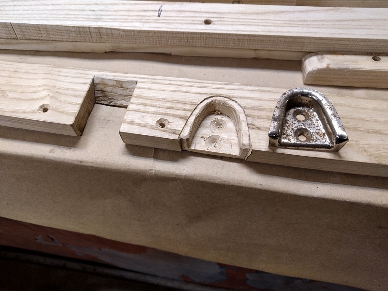Det blev ju en smula tunt med material i träet runt låsnäsan och den nya styrplåten, men båda dessa är ju skruvade och gängade i C-stolpens förstärkningsplåt i stolpen, så det kommer inte att bli någon som helst påkänning på denna bit.