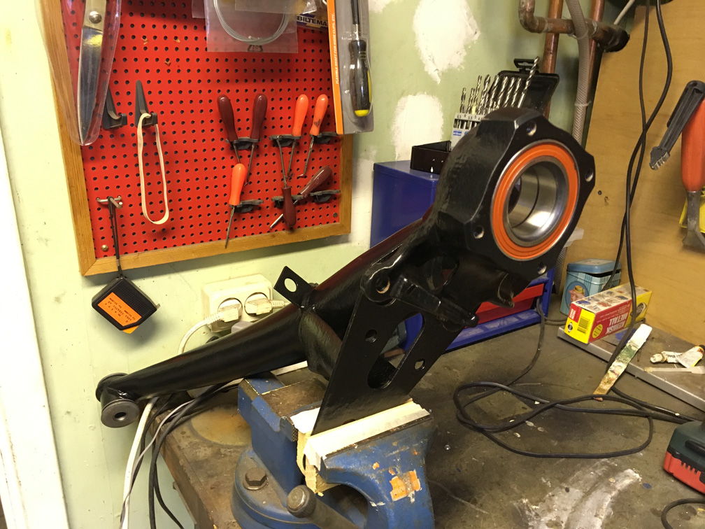 Främre bärarmarna har jag tyvärr inga bilder på. Det är gamla bärarmar som blästrats och pulverlackats. De gamla bussningarna får man bränna bort. Tog en liten brännare typ de som finns på Biltema och efter ett tag så kryper den gamla bussningen av. Efter lack så fick jag låna en press av en kompis och pressade dit nya bussningar.