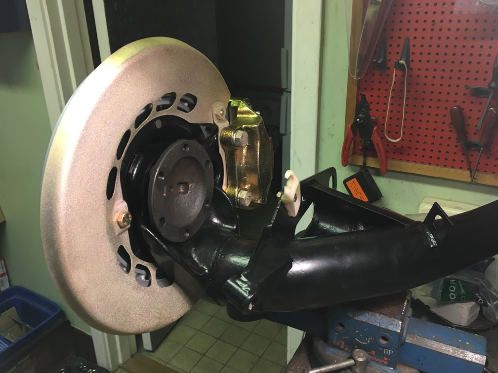 Fick också jaga tag i ny låsmutter till spindlarna då de hade en större dimension än original. Aluminiumhubbarna glasblästrades och fick nya lagerbanor och lager. Bromssköldarna är gamla som fått gulkromatering.