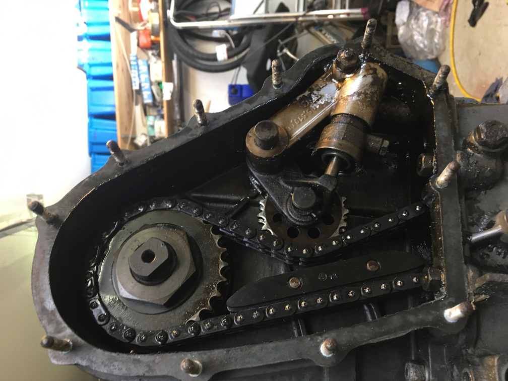 Det är en hel del frågor man måste ställa sig innan man kan sätta ihop motorn igen. Ska det trimmas? Nej, jag kör original kolvar och kammar. Ska man uppgradera till hydrauliska kamkedjesträckare? Jag har tagit beslut att inte göra det. Det för med sig ytterligare ca 15.000 kr i delar. Kamkedjesträckarna är nog det mest omskrivna av alla dessa motorers detaljer. Min har hydrauliska/mekaniska som original. De kan man renovera och jag kommer till det senare. De som man monterar vid en uppgradering är hydrauliska och är en del av oljeförsörjningen. De som kör race har ofta "fasta" sträckare som man spänner mellan racen. En fallerande sträckare är inte bra, då kan, i värsta fall, kamkedjan kugga över med motorhaveri som följd. Börjar det rassla vid kamkedjekåporna så ska man inte köra en meter till. Min motor hade inga tecken på att kedjan varit så ospänd. Jag kommer som sagt renovera sträckarna och sedan, som extra åtgärd, montera ett stopp på sträckaren. Det är en eftermarknadsdetalj som hindrar sträckaren från att helt gå ned på sitt lägsta läge. Då får jag en indikation av kedjerassel och kan åtgärda innan katastrofen.