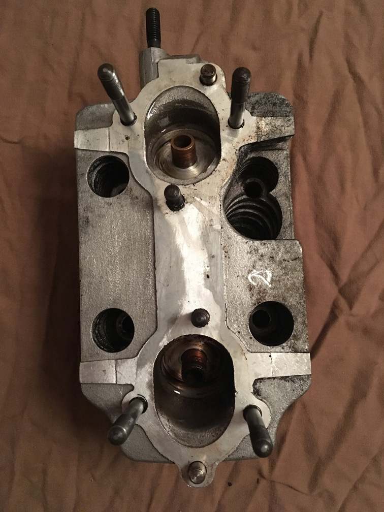 Jag fick låna en liten ultraljudstvätt som fick gå varm. Avfettning, brake cleaner, trasor och borstar för att få allt så rent som möjligt. Topparna fick sig en omgång av glasbläster innan de ska skickas på inslipning av ventiler och montering av ventilstyrningar. Några ventilsäten får vi nog också byta. Det visade sig vara vatten i två cylindrar. Vatten – på en luftkyld motor? Jag gissar att de spolat av den med högtryck eller liknande nån gång innan jag fick motorn.