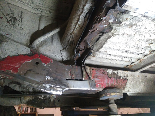 Ramskenan återställd så har jag något satt fästa utriggaren i:) Får skära upp golvet och byta hattprofilbalken innan undre tvärbalk (som är helt bortrostad faktiskt!)