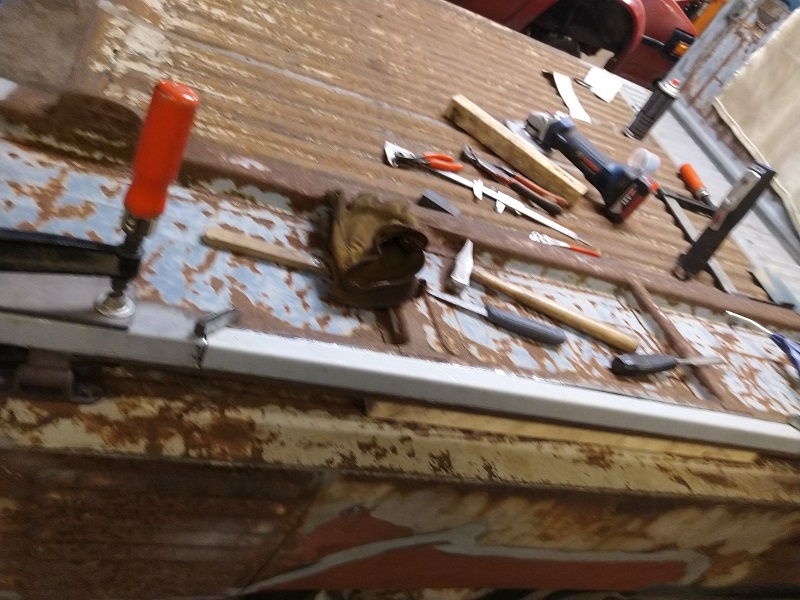 Eftersom den nya bottnen var i två delar så blev jag ju tvungen att svetsa ihop dessa till en lång bit. Klämde fast dessa mot mitt stadiga plåtbord med en aluminiumskiva emellan, samt att jag hade en rak fin stålbalk som extra trygghet för att få det så rakt som möjligt.